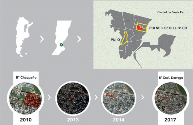 Con esta injerencia teórica y considerando como antecedentes el modelo de favela -bairrio en Brasil- y el PUI Medellín en Colombia, en la ciudad de Santa Fe, Argentina, desde el año 2012 son instrumentalizados los Programas Urbanos Integrales del Oeste (PUI O) y del Noreste (PUI NE). A partir de sucesivos convenios y adendas de Colaboración y articulación de políticas de hábitat (Secretaría de Estado de Hábitat, 2012) entre organismos estatales y el Movimiento Los Sin Techo (MLST), y centrándonos principalmente en las políticas urbanas de suelo y vivienda destinadas hacia población empobrecida, este modelo de abordaje integral comprendió: i) la relocalización de familias; ii) la demolición de las viviendas existentes y la construcción de módulos habitacionales mínimos de materiales prefabricados por autoconstrucción y ayuda mutua, y iii) la regularización dominial del lote y la adjudicación de las viviendas. Sin embargo, este programa fue el marco político que nucleó a otros programas parcializados3.