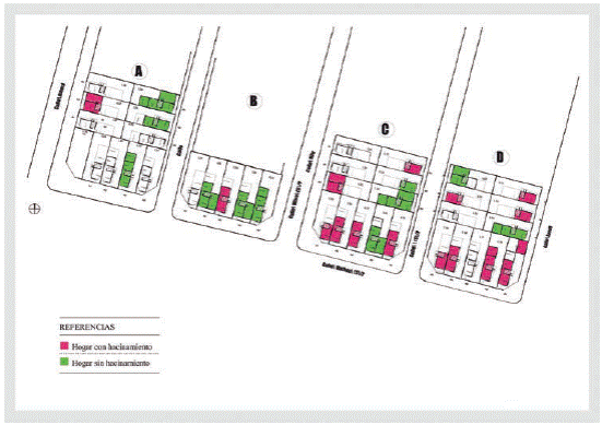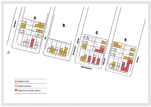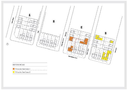 Según las entrevistas realizadas puede apreciarse, en dos de las cuatro manzanas de la relocalización, que los vínculos familiares de la antigua residencia se conservaron, así como los lazos establecidos entre algunos vecinos (figura 4). Esta situación ha posibilitado que las familias conecten sus viviendas internamente a través de sus patios en el fondo de la manzana, por ejemplo. No obstante, no se observa que se encuentren solidificados modos de organización o la conformación de redes sociales entre las familias relocalizadas para realizar reclamos u otro tipo de cuestiones de forma conjunta, aunque tampoco se evidenciaba esta organización en la anterior residencia. En este marco, son pocos los vecinos que tienen noción sobre la Vecinal CD, construida dentro del propio loteo de la relocalización, y solo uno de los entrevistados mencionó que un familiar participaba en actividades desarrolladas allí.