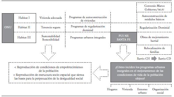 En este artículo buscamos relacionar la injerencia de los postulados promulgados por la ONU en la materialización de programas urbanos del ámbito local. Empero, más que profundizar en el análisis sobre el funcionamiento de estos, direccionamos el interés hacia su incidencia en el mejoramiento de las condiciones de vida de la población objeto (cuadro 5). Ejemplos de esta injerencia son los dos antecedentes mencionados para el caso santafesino: Favela-Bairro del BID y los PUI Medellín de la AFD. A pesar de erigirse desde distintas líneas de financiamiento, estos programas comparten el mismo marco conceptual con génesis teórica en la urbanización de la pobreza, difundida y reforzada periódicamente a través de las campañas globales de la ONU y demás oí que comparten esta línea. Tal como vimos, esta injerencia materializada en el caso local (figura 6) investigado, legitimada ideológicamente desde este marco conceptual, en algunos casos produjo desplazamientos de la población empobrecida -a través de programas de relocalización de población- y en otros permanencias de esta población -a través de programas de titularización del suelo-.