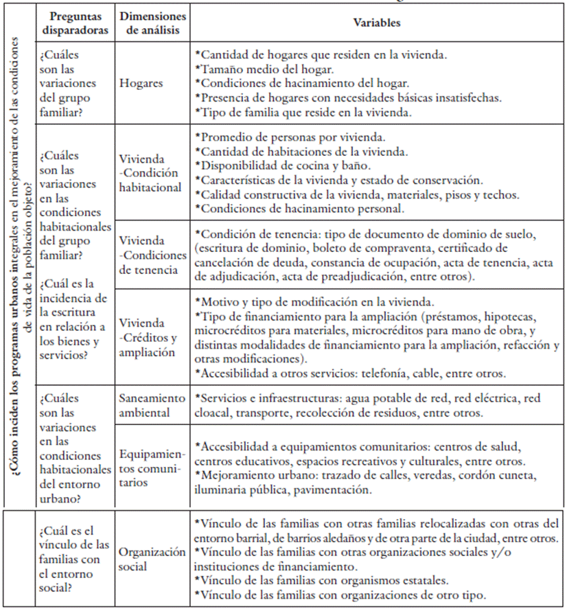 Para la selección de las dimensiones de análisis, consideramos las contribuciones sobre la noción de hábitat residencial sostenible5 (Jirón, Toro, Caquimbo, Goldsack & Martínez, 2004, pp. 13-15), entendida como un relación que abarca procesos habitacionales complejos tanto en dimensiones objetivas como subjetivas que incluyen a la vivienda, su entorno inmediato, el conjunto habitacional, el barrio y el contexto urbano mayor. Siguiendo a esta fuente, la habitabilidad es determinada por la relación y la adecuación entre el humano y el entorno donde vive, y se refiere a cómo cada una de estas escalas es valorada de acuerdo a un conjunto de factores considerados relevantes por el habitante (Jirón, Toro, Caquimbo, Goldsack & Martínez, 2004; Núñez, 2012). A partir de estos aportes, las variables de análisis construidas en nuestra investigación estuvieron relacionadas con las siguientes preguntas disparadoras (tabla 1).