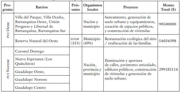 En la actualidad, son dos los PUI gestionados (figura 1): el PUI del Noreste, que comprende a las familias que residen en los barrios CD, Nueva Esperanza, Guadalupe Oeste, Guadalupe Noreste y Guadalupe Central, entre otras zonas, y el PUI del Oeste, que abarca a las familias de los barrios Villa Oculta, Villa del Parque, Barranquitas Sur, Barranquitas Oeste y Pro Mejoras Barranquitas. Ambos programas fueron instrumentalizados en sectores urbanos donde residen hogares empobrecidos en condiciones precarias de tenencia de la vivienda y del suelo13 desde hace al menos tres décadas (tabla 2).