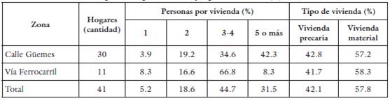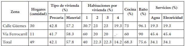 Sobre la calle Güemes, en un 40% de estas viviendas residían más de 5 miembros, y en un 70% residían entre 3 a 4 personas por vivienda. Por otro lado, el 30% de las viviendas localizadas allí disponían de una habitación, la mayoría tenía baño, un 70% tenían cocina y un 20% agua y electricidad mediante conexiones precarias. El 65% de las viviendas restantes disponían de entre 2 y 4 habitaciones, solo un porcentaje cercano al 20% tenía agua y electricidad, y 24% de los hogares censados en la segunda etapa de relocalización tenían boleto de compraventa. Por otro lado, las familias que residían sobre la vía en su mayoría también disponían solo de una habitación, y un 40% tenían entre 3 a 4 habitaciones. A pesar de estas condiciones, las 11 viviendas disponían de agua y electricidad (tabla 4).