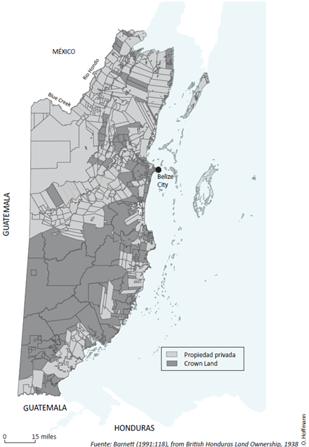 En 1911, en respuesta a una encuesta llevada por la Corona en 14 de sus colonias y protectorados, el Acting Governor Wilfred Collet -en representación del gobierno colonial local en Belice- distinguió entre las tierras de propiedad privada (51% del total) y las tierras atribuidas en lease, es decir renta o concesión (46%). Menciona dos reservas "caribs" (garífunas), pero desconoce otro tipo de tenencia, la colectiva indígena que, contradictoriamente, por estos mismos años su propio gobierno intentó promover. Afirma tajantemente que toda la tierra disponible está bajo el control de la Corona y que ningún grupo nativo reivindica la propiedad (Harcourt, 1912). Otro informe, en 1917, se enfocó hacia los posibles futuros de la agricultura en el territorio, un tema estratégico dadas las penurias crónicas en alimentos. Sostuvo que el problema no provenía de la concentración de las tierras y que no había mayor problema en cuanto al acceso a las tierras de cultivo, ya que los grandes propietarios rentan porciones de sus tierras a precios accesibles.4 Un tercer informe, en 1920, sobre el mismo tema, presentó una opinión radicalmente opuesta. Señaló que las tres cuartas partes de la superficie productiva estaban en manos de la gran propiedad privada, y denunció sin equívoco el hecho de que tal predominio había generado prácticas de despilfarro y negligencia.5