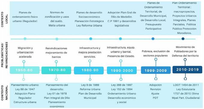 En la siguiente línea del tiempo (figura 1) se plasman y ponen en diálogo datos que dan cuenta de las consideraciones anteriores. En esta, el lector podrá identificar aspectos sobre la política, el desarrollo urbano y la gestión del territorio, característicos de la tradición planificadora en Medellín, y su relación con las problemáticas y reivindicaciones urbanas desde mediados del siglo pasado hasta el presente.