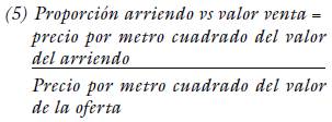 En cuanto al segundo aspecto, la relación entre el valor de alquiler por metro cuadrado de los inmuebles y su precio comercial, se capturó información del mercado inmobiliario de plataformas comerciales de intermediación inmobiliaria con la técnica de web scraping, a través de la cual se obtuvieron 60.615 registros de inmuebles en oferta para venta y 23.404 registros de inmuebles en arrendamiento con atributos de localización, precios, área y tamaño. A partir de esta información, y dada la escasez de coincidencia en valores de venta y arrendamiento para el mismo inmueble, se implementó un esquema de emparejamiento por características similares entre los inmuebles en venta y arrendamiento, teniendo en cuenta los atributos de: sector catastral, tamaño,4 tipo de inmueble (casa o apto) y estrato. De acuerdo con esto, se plantea la relación entre el valor de alquiler por metro cuadrado y precio de venta por metro cuadrado entre los inmuebles emparejados, de la siguiente manera: