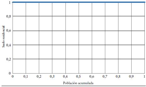 La figura 1 presenta una distribución totalmente equitativa del potencial de acceso al suelo urbano, es decir, un escenario hipotético de "segregación nula" en el que todos los hogares tienen acceso potencial al 100% del suelo urbano residencial, lo cual forma una "curva de segregación" horizontal que corta al eje de las ordenadas en el punto uno. Este es un escenario de referencia donde cada grupo de población podría potencialmente localizarse en cualquier lugar de la ciudad.