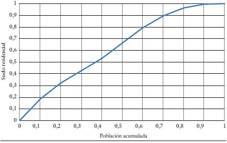 De esta manera, se busca establecer una medida estadística a partir de la relación entre la distribución de la población de la ciudad -ordenada según su capacidad de gasto en espacio construido (del hogar) - con respecto a su potencial efectivo de acceso al suelo urbano residencial (gama de localizaciones factible). Si se representa de manera gráfica esta relación, se tendrá un plano donde en el eje de las abscisas se representa la población acumulada, ordenada según su capacidad de gasto en espacio construido, y en el eje de las ordenadas se representa el suelo residencial acumulado. De esta manera, cada punto sobre el plano expresa el porcentaje de suelo al que tiene acceso potencial (gama de localizaciones factible) cada grupo de población acumulada según su capacidad de gasto en espacio construido.