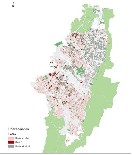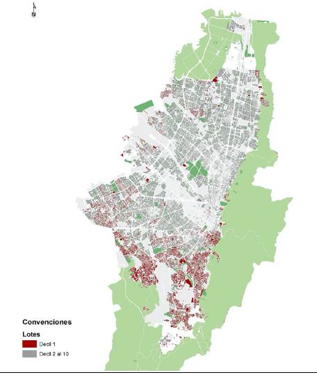 Así, la gama de localizaciones factible para el decil 1 de población, la de menor capacidad de gasto, se presenta en la figura 3, donde se encuentran marcados de color rojo todos los lotes a los que este grupo de población tiene acceso potencial y, en contraste, en color gris todos los lotes de uso residencial que se encuentran por fuera de su capacidad de gasto. Como se observa, los hogares del decil 1 de la población, solo tienen acceso a una gama restringida de lotes localizados principalmente al sur de la ciudad.