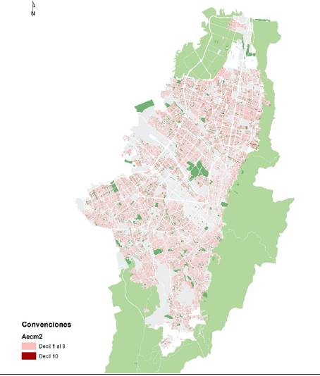 Finalmente, en el otro extremo se encuentran los hogares con mayor capacidad de gasto, el decil 10 de la población (figura 5), quienes, teniendo acceso potencial a todos los lotes de la ciudad, son los únicos con la capacidad económica de acceder a las localizaciones que en el plano de las representaciones colectivas ostentan la connotación social más positiva de la ciudad, de las cuales se encuentran económicamente excluidos los demás grupos de la escala social. Estos hogares tienen el poder económico para excluir, a través de la operación del mercado de suelo, a todos los demás hogares de esas localizaciones privilegiadas o exclusivas, dada su disposición a pagar una elevada renta de monopolio de segregación.