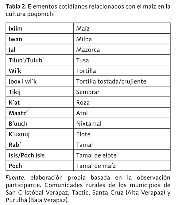 De hecho, y como indican Micelli y Crespo (2012), el ciclo del maíz condiciona toda la cosmovisión maya, que se fundamenta sobre un sistema profundamente articulado, que incluye, a su vez, un complejo sistema matemático. El grano de maíz representa el resumen de toda la cosmovisión maya, el carácter cíclico de la vida y la continuidad. Es origen y fin. De la totalidad de la mazorca, de la que forma parte, regresa a la tierra para generar a su vez la vida. Supone la síntesis de la unión del Cielo y de la Tierra, esto es, del Corazón del Cielo y del Corazón de la Tierra (Florescano 1992), auténtico diagrama cósmico. En su representación y forma, el mismo grano de maíz simboliza las cuatro esquinas de la tierra, siempre presente en cada uno de los acontecimientos de la vida de los mayas. Al igual que ocurre con la dificultad de distinguir entre lo profano y lo sagrado en la totalidad de la cosmovisión maya-poqomchi', el maíz es la pieza angular sobre la que reposan tanto los elementos más básicos de la cotidianidad como los aspectos cultuales y rituales que nutren y suponen la base de la identidad del pueblo (ver la tabla 2).