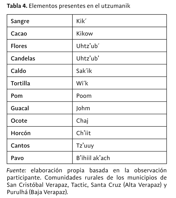 En el marco de la celebración aparecen diversos rasgos que se muestran comunes a las celebraciones mayas en términos generales, unidos a la lengua poqomchi', que es el primer signo de identidad que se torna en aspecto diferenciador y, al mismo tiempo, de cohesión entre los miembros de la comunidad. El primero de los elementos es el copal o poom, resina aromática vegetal que se usa como incienso de manera sempiterna, durante todo el transcurso de la celebración, y que muestra la elevación de las plegarias que de manera etérea suben de la tierra al cielo, y se dirigen al Ajaw, al Uk'ux kaj o Corazón del Cielo, desde el Uk'ux ulew o Corazón de la Tierra. El uso del copal se remonta a los tiempos del esplendor maya, y su presencia da fe de la relación entre los actuales colectivos (Cruz, Salazar y Campo 2006), entre ellos los poqomchi'es y los mayas originarios que se asentaron en la región. El otro importante elemento que resulta crucial es el uhtz'ub' o candelas, símbolo de la luz, del fuego y del sol. El fuego es un elemento sagrado que desde las épocas ancestrales ha perdurado, y cuya consideración aún se halla muy vigente (Morales 2004). Como indica Cochoy (2006, 20-21), "el fuego sagrado es de comunicación, interconexión e interrelación trascendental con la conciencia del Universo". Es símbolo de la sabiduría legada por los antepasados, y aún se halla vigente. Por ello, se convierte en el símbolo real, palpable, y "medio para orientarnos a la conexión con la Sagrada Naturaleza, con el Universo" y con la humanidad. Por su parte, tanto a los K'atal uhtz'ub', o quienes tienen el ministerio de quemar las velas, como a los guías espirituales (nahool/Iq'omaneel6) (Buc Quej 2013) les sirve de base para interpretar los movimientos del fuego y comunicar a la comunidad las señales que se derivan de todo el proceso (Chonay 2002).