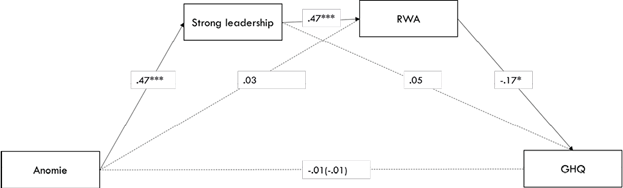H4: Perceived anomie will have a sequential indirect effect on psychological distress through support for strong leadership and RWA.