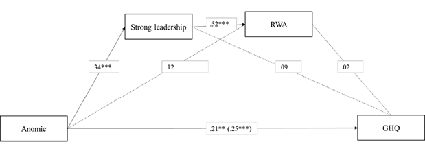 The primary objective of this study was to investigate a sequential mediation model wherein perceived anomie influences psychological distress through support for strong leadership and RWA. The results largely substantiated our hypotheses while also revealing notable discrepancies between the two countries examined.