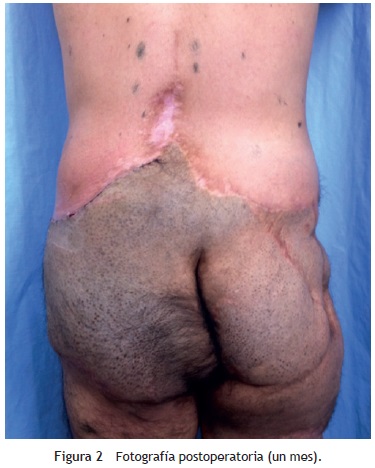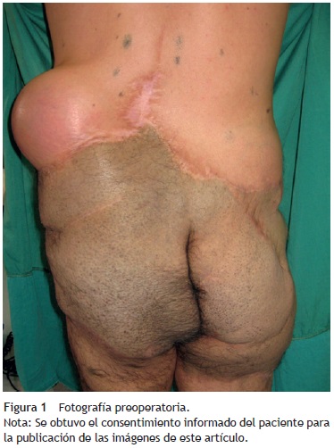 paciente masculino de 40 años con nevus melanocítico congénito que compromete las regiones lumbar y glútea, así como las caras posterior y lateral de los muslos izquierdo y derecho, para un 15% aproximado de su superficie corporal total comprometida. desde los 11 años es sometido a re-secciones intralesionales y a colocación de expansores de tejido.
