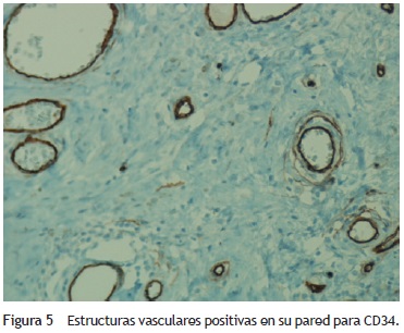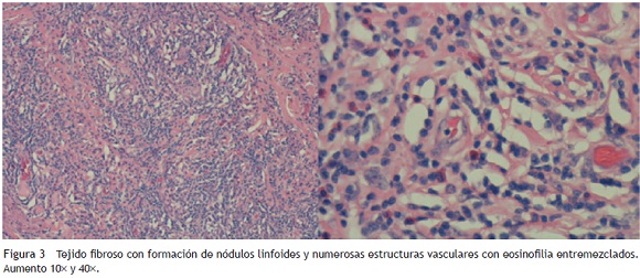 En patología se revisa el producto enviado y se encuentra en el tejido subcutáneo proliferación de estructuras vasculares tapizadas por células endoteliales hiperplásicas, asociada a un componente de células inflamatorias, compuesto, a su vez, por abundante cantidad de eosinófilos y linfocitos dispuestos de manera difusa y en folículos linfoides (fig. 3). dicha lesión se disponía alrededor de fragmentos de cápsula y se asociaba a la presencia de fibrosis estromal.