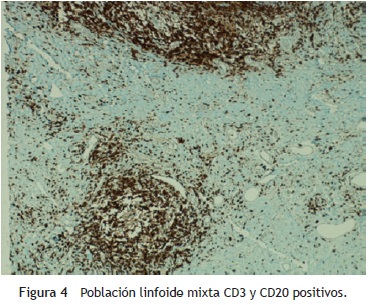 En el tejido celular subcutáneo de la lesión névica había focos de reacción granulomatosa tipo cuerpo extraño. se realiza inmunohistoquímica, a raíz de lo cual se halla que la población linfoide de la cápsula es mixta Cd3 y Cd20 positivo, bcl-2 y ciclina d1 negativo con proliferación vascular importante que marca Cd34. se realiza HHV-8, que fue negativo (figs. 4 y 5).