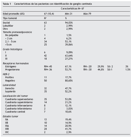 Las características demográficas de las 67 pacientes restantes se muestran en la tabla 1: la edad promedio fue de 53,3 anos (DS 10,46); el 94,03% de los tumores fueron ductales; el 63,6% fueron de grado II histológico y el 27,2% de grado III; el 9% fueron tumores grado I; el 67,1% tenían receptores de estrógeno positivos y el 53,7% expresaron receptores de progestágeno. El 17,7% sobreexpresaron el receptor 2 del factor de crecimiento epidérmico humano (HER-2) detectado con inmunohistoquímica o Fish en caso de prueba indeterminada.