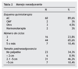 Como se muestra en la tabla 2 el esquema de quimioterapia más usado fue AC (adriamicina-ciclofosfamida), habiéndolo recibido el 89,6% de los pacientes. Dos pacientes (3%) recibieron CMF (ciclofosfamida-metotrexate-5fu). El 4,5% restante otro tipo de terapia. Dos pacientes (3%) recibieron hormonoterapia (letrozol y exemestano).