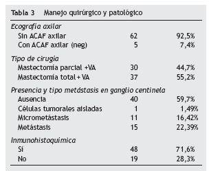 Al 44,7% de las pacientes se les ofreció como tratamiento quirúrgico mastectomía parcial y a las demás pacientes mastectomía total (tabla 3). Todas las pacientes fueron sometidas a VA.