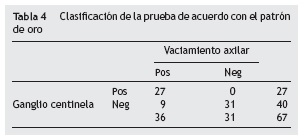 La proporción de identificación fue definida como el número de pacientes, en las que se logró aislar el ganglio centinela para biopsia, dividida por el número total de pacientes en quienes se intentó aislar. Los resultados para cada ganglio centinela identificado satisfactoriamente fueron categorizados como verdadero positivo, verdadero negativo o falso negativo, tomando el desenlace de vaciamiento axilar como referencia estándar. Un ganglio centinela verdadero negativo (VN) fue definido como ganglio centinela negativo y un vaciamiento axilar negativo, un falso negativo (FN) como un ganglio centinela negativo con vaciamiento axilar positivo y un verdadero positivo (VP) como un ganglio centinela positivo con o sin vaciamiento axilar positivo. Basados en esta definición, se asumió que no hay casos de falsos positivos. Los parámetros operativos de la prueba fueron: sensibilidad, proporción de falsos negativo, valor predictivo negativo y precisión. Se utilizó STATA 10 para el análisis estadístico. El estudio fue aprobado por el comité de ética del INC.