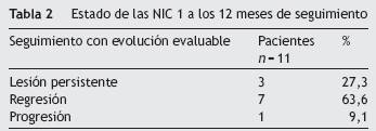 De las 23 pacientes con seguimiento, el 63,6% expe rimentaron desaparición de la lesión (tabla 2). La lesión progresó en una paciente y se llevó a cabo tratamiento ablativo. En una mujer, al final del seguimiento, la NIC 1 persistió y se introdujo en el canal; fue sometida a conización cervical. De las pacientes que ingresaron al estudio, 9 (22,5%) recibieron tratamiento destructivo local por médi cos externos; entre estas, 6 (23%) formaron parte de las que asistieron completa o parcialmente a las citas a colposcopia (fig. 2).
