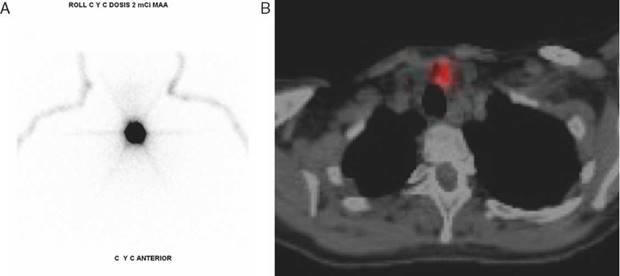 Figura 3 Marcación con Tc-99m-MAA: A. Imagen planar con SPECT donde se observa lesión focal. Infortunadamente con esta imagen solo se puede verificar si la inyección es de buena calidad, ya que no se puede determinar ninguna referencia anatómica. B. Imagen axial fusionada con SPECT/CT en la que se localiza lesión nodular pretraqueal izquierda correspondiente a recaída ganglios subcentimétricos de grupo vi.
