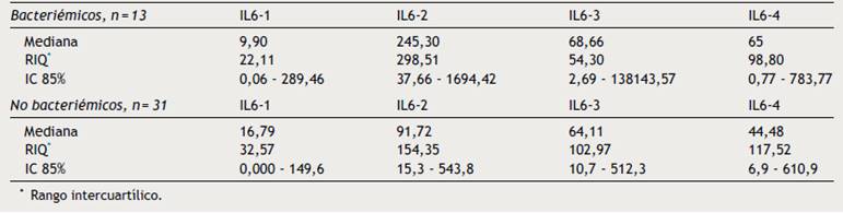Tabla 3 Niveles séricos de IL6 (pg/mL) distribuidos por medianas según la presencia o no de bacteriemia