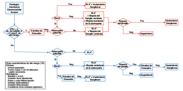 La conducta en pacientes con CEC de bajo riesgo con adenopatía palpable es la escisión del tumor con margen quirúrgico de 4-6 mm24,29 y el estudio del ganglio mediante aspiración con aguja fina (ACAF). Si el informe citológico es negativo se encuentra indicado realizar biopsia escisional de la adenopatía, con el fin de hacer el diagnóstico diferencial entre un verdadero negativo (adenopatía de etiología inflamatoria/infecciosa) y un falso negativo31. Si el ACAF es positivo el paciente debe ser estudiado con imágenes para caracterizar el compromiso ganglionar y será definido como candidato a un vaciamiento ganglionar del nivel afectado y de un nivel superior cuando sea factible31.