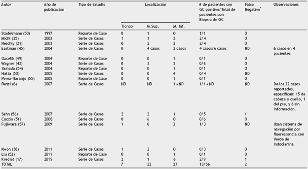 A diferencia de los pacientes con CEC de cabeza-cuello y CEC anogenital, en pacientes con CEC de tronco y extremidades no hay evidencia científica de alta calidad que permita establecer la utilidad del ganglio centinela para el CEC de alto riesgo. La evidencia se encuentra limitada a pequeñas series de casos en las que se expone el uso de esta técnica como extrapolación del procedimiento en CEC de cabeza y cuello49-52 . En la tabla 1 se extraen los pacientes con CEC no anogenital del tronco y extremidades de los reportes y series de casos disponibles en la literatura, a quienes se les realizó biopsia de ganglio centinela9,18,22,26,43,46,49-58. La experiencia de casos clínicos sugiere que la biopsia de ganglio centinela en esas localizaciones permite identificar de forma precisa el compromiso metastásico ganglionar y además de ser un procedimiento bien tolerado por los pacientes. Sin embargo, es necesaria la realización de ensayos clínicos al respecto para definir el beneficio en la supervivencia y establecer una indicación precisa8.