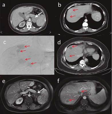 Figura 1 Escanografías abdomen con medio de contraste: (a) Masa lobulada sólida con calcificaciones en cola del páncreas, envuelve vasos esplénicos, diámetros mayores en plano axial de 95 x 45 mm. (b) Metástasis hepáticas la mayoría hipervasculares. (c) Arteriografía embolización: cateterización segmentaria hepática derecha muestra. (d) Imagen postembolización: ausencia de realce como respuesta al tratamiento compromiso metastásico multifocal predominio lóbulo hepático derecho. Resonancia magnética abdomen superior con gadolinio. (e) Masa en cola de páncreas con escaso realce, su tamaño se mantiene. (f) Lesiones focales hepáticas sin realce con gadolinio como respuesta al tratamiento.