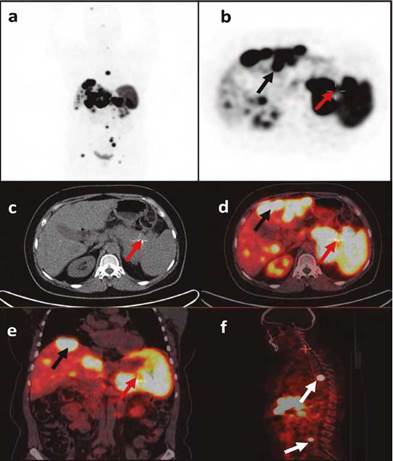 Figura 2 PET Galio 68 - DOTATOC. Representación PET (a, b), TAC (c) e imágenes fusionadas (d, e, f). Se observa masa en cuerpo y cola páncreas (flechas rojas), metástasis hepáticas (flechas negras), metástasis en columna (flechas blancas).