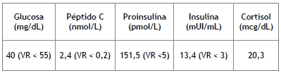 Durante el seguimiento, la paciente presentó síncope con síntomas neuroglucopénicos e hipoglucemia (glucosa sérica 40 mg/dL). Se le realizó test de ayuno que confirmó hipoglucemia hiperinsulinémica (tabla 1) con marcación negativa para insulina en inmunohistoquímica en la biopsia hepática.