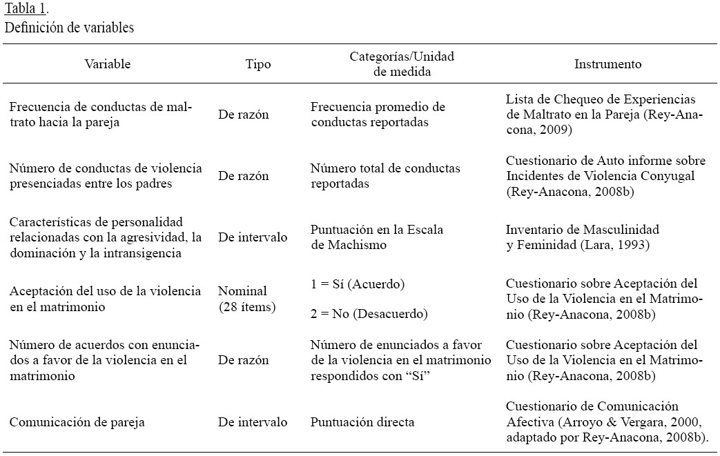 Cuestionario sobre Aceptación del Uso de la Violencia en el Matrimonio (Rey-Anacona, 2009b). El instrumento original permite manifestar el acuerdo o desacuerdo con 14 enunciados referentes al uso de la violencia por parte del esposo hacia la esposa, siendo validado a nivel metodológico por dos jueces y a nivel de contenido por tres jueces expertos en violencia en la familia (Rey-Anacona, 2008b). En esta investigación se incluyeron otros 14 ítems correspondientes a los 14 originales, pero en relación con la conducta de la esposa hacia su esposo. El alfa de Cronbach obtenido fue .89 (Rey-Anacona, 2009b).
