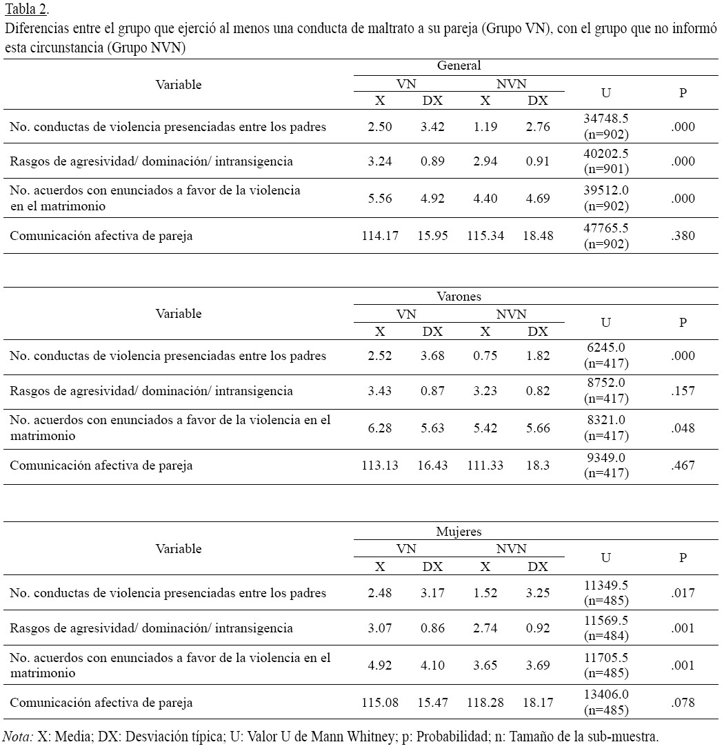 En la tabla 2 se presentan los resultados de las comparaciones efectuadas entre el grupo que ejerció al menos una conducta de maltrato a su pareja (Grupo VN), con el grupo que no informó esta circunstancia (Grupo NVN), las cuales mostraron que los primeros presenciaron un número significativamente mayor de conductas de violencia entre sus padres comparados con los participantes del Grupo NVN, tendencia que se observó entre los varones aunque con un tamaño del efecto entre bajo y moderado (d = 0.37), así como entre las mujeres con un tamaño del efecto bajo (d = 0.26).