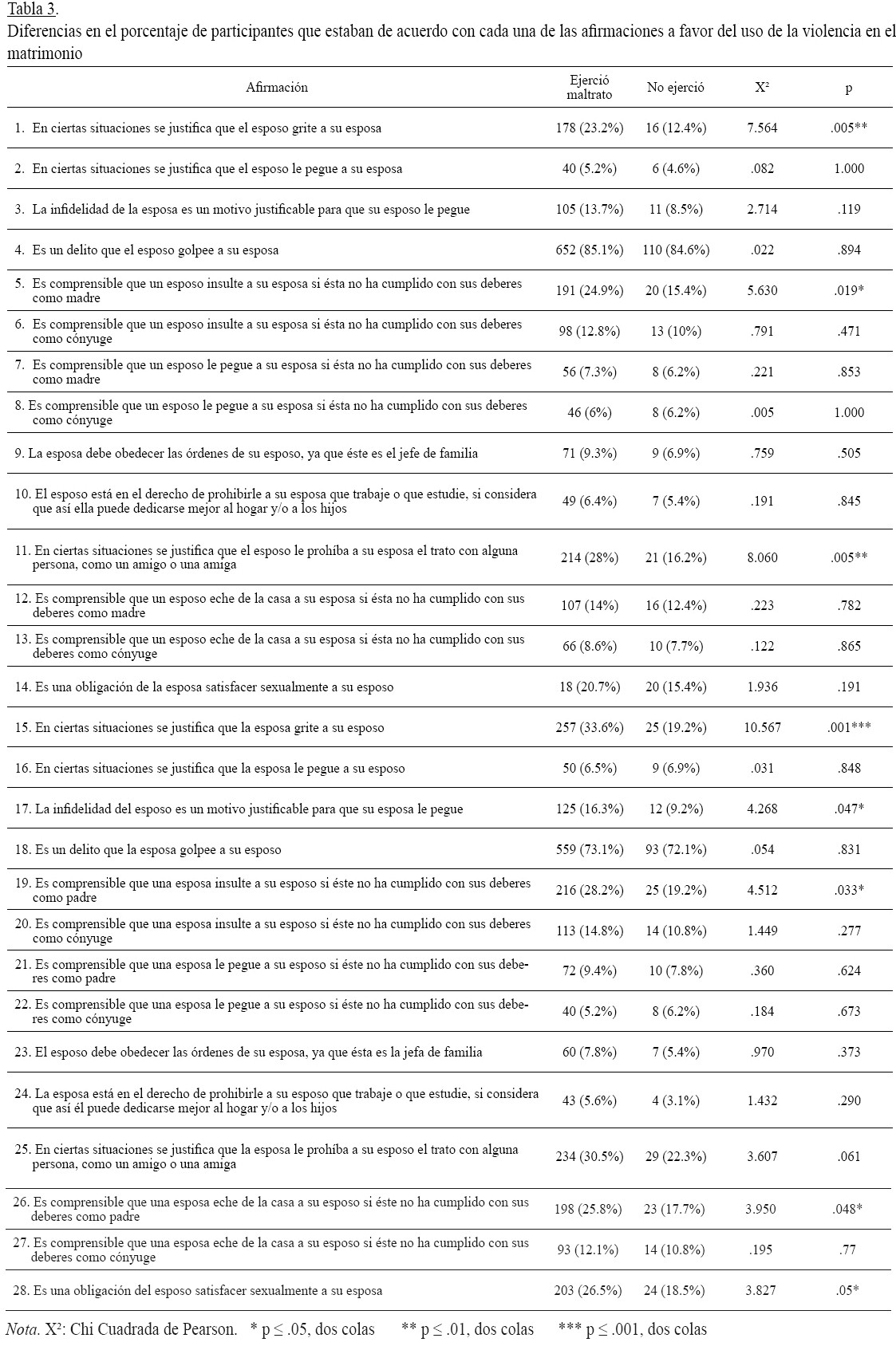 En cuanto a la aceptación del uso de la violencia en el matrimonio, las comparaciones realizadas con respecto al porcentaje de participantes del grupo VN y el Grupo NVN, que estuvo de acuerdo con cada una de las 28 afirmaciones que se presentan en el Cuestionario sobre Aceptación del Uso de la Violencia en el Matrimonio, mostró que los participantes que ejercieron alguna conducta de violencia a su pareja estuvieron más frecuentemente de acuerdo con ocho de estas 28 afirmaciones (véase Tabla 3).
