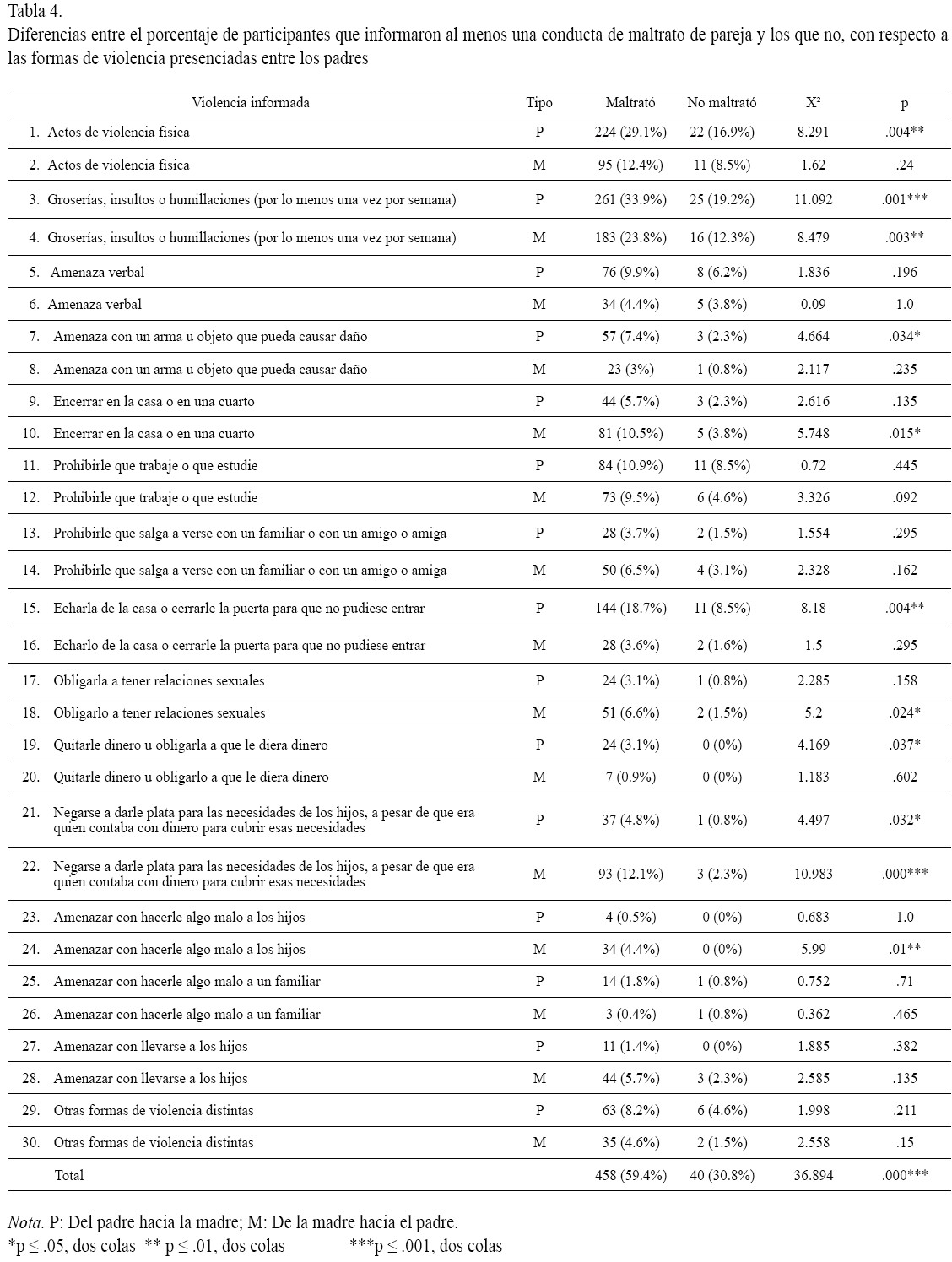 En la tabla 4 se compara el porcentaje de participantes del grupo VN y del grupo NVN, que reportaron haber presenciado cada una de las 30 conductas de violencia entre los padres que se presentan en el Cuestionario de Auto informe sobre Incidentes de Violencia Conyugal. Los datos que aparecen en dicha tabla muestran que los participantes que ejercieron alguna conducta de maltrato hacia su pareja informaron con mayor frecuencia haber presenciado once de estas 30 conductas de violencia entre los padres.