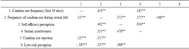 For the women's group, significant correlations were obtained between the condom use frequency in the last 30 days along with the variables sexual assertiveness (r=141), as well as condom use during their sexual life with the variables self-efficacy (r=372) and sexual assertiveness (r=275). A significant negative correlation between condom use and rejection to use it was found (r= -168).