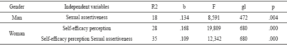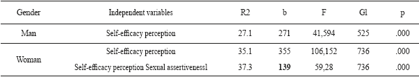 An analysis of condom use in sexual life was done for men and women; the proposed model in Table 4 for the men's group indicates that self-efficacy perception predicts a 27.1% of condom use, whereas in the women's group this same variable predicts a 35% of condom use and a 37.3% in the perception model of self-efficacy and sexual assertiveness.