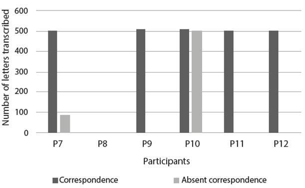 On the other hand, the six participants who first experienced the correspondence blocks and subsequently the absence of correspondence blocks, chose the delayed rein-forcer in the first block; five completed letter transcriptions in approximately 30 minutes (P7, P9, P10, P11 and P12) and one performed more than half of the transcription (P8), leaving the task 15 minutes after the start of the execution (before the presentation of the fourth instigator).