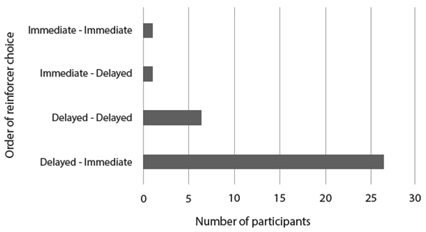 In the same sequence of presentation of the blocks, 13 participants maintained their behavior in the two measurements of self-control; 12 of them behaved according to delayed consequences after each block of trials, and one according to immediate consequences in both measurements.