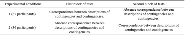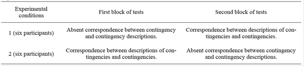 All participants were exposed to the following phases: a) correspondence trials, b) task of choice, c) absent correspondence trials, and d) choice task. The difference between the two experimental conditions was the order in which the test blocks were presented, as shown in the design section. For the two experimental conditions a conditional discrimination procedure was used consisting of14 correspondence trials between descriptions and contingencies, and 14 absence correspondence trials, presented all of them with the Microsoft Office Power Point 2007 program.