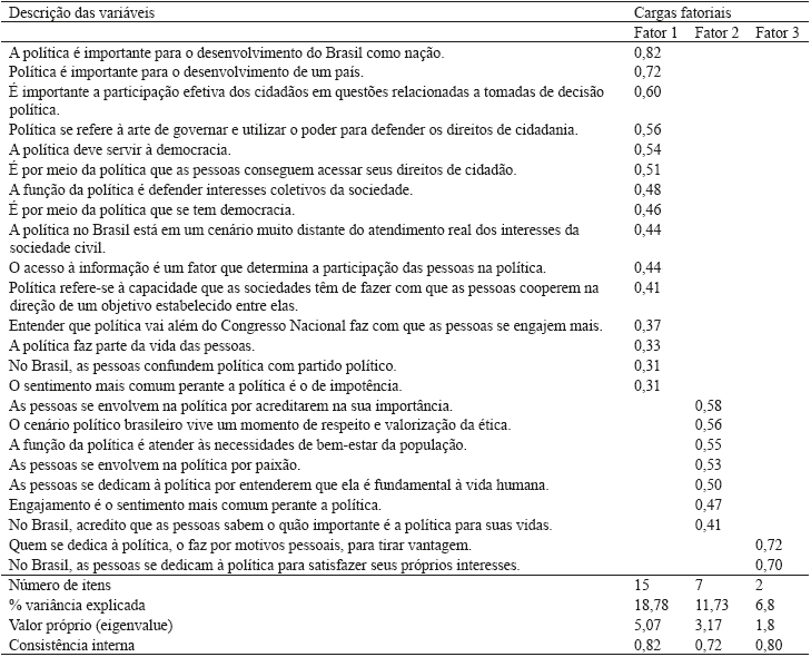 Na solução forçada em três fatores, também por meio da PAF, com rotação oblíqua e tratamento listwise dos dados omissos, encontrou-se uma estrutura empírica mais parcimoniosa. As cargas fatoriais variaram de 0,82 a 0,31. Optou-se por não retirar os itens com cargas próximas à 0,30, por serem consideradas minimamente aceitáveis, conforme Fabrigar, Wegener, MacCallum e Strahan (1999) e Hair, Black, Babin e Anderson (2010). O primeiro fator, denominado "Grau de conhecimento sobre política", constituído por 15 itens, corresponde à avaliação dos respondentes sobre o que é política. O alfa foi de 0,82, com valor próprio de 5,07 e variância explicada de 18,78 %. Mais especificamente, esse fator empírico diz respeito ao grau de informações que os respondentes possuem sobre características da política. Ou seja, sua importância ao andamento de uma sociedade democrática, bem como as reações que os indivíduos têm ao mencionar o termo política. A importância da política à manutenção do conceito de sociedade bem como sua relação com o conceito de democracia também foram conteúdos contidos nos itens.