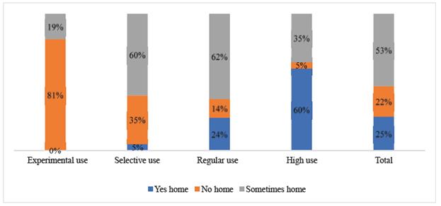 Regarding access to alcoholic beverages, it was found that 97% of young people in the high use group and 84% of the regular use, have been at parties where alcohol is served to minors; while this phenomenon occurred in 55% of the experimental use group and 42% of selective use. Consistent with this finding, it was found that a significant proportion of active consumers have drunk alcohol at parties held in homes, compared to those who do not currently consume alcohol (see Figure 5).