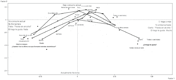 The MCA identified three factors (see Figure 1); the first and main factor separates students by levels of con sumption, from students who tried alcohol sometime in the past but do not currently consume, to the students of higher consumption who said that they like alcohol very much and have been drunk. The second factor was related to the start of consumption, consumption behavior and risk behavior. This factor separates the students who said they had had "hang over", who started consuming more than a year ago, and started consuming alcohol with rum or brandy, from the students who have a regulated consumption. The third factor separates the cases by two types of consumption: a consumption at home, drinking wine, without being at parties where alcohol is served, from those participants who said they like a lot to drink, had a beginning of alcohol consumption at an early age, have consumer friends, start with rum, brandy or aguardiente and perceive that getting alcohol is more or less easy.