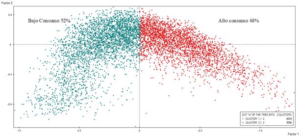 After establishing the factors, an analysis was carried out using the Ward method as a way to gather the individuals into homogeneous groups. The dendrogram suggested that there are two groups of alcohol consumers: a low consumption group that corresponds to 52% of the included data and another group of frequent consumption that corresponds to 48% of the sample (see Figure 2). Subgroups were identified in each of them.