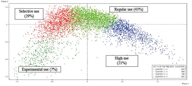 In order to identify the subgroups, a segmentation alternative was explored which showed four groups: (a) Selective use (29%, 2,039 young people), (b) Regular use (43%, 3,400 young people), (c) High use (21%, 1,591 young people); and, (d) Experimental use (7%, 595 young people), which were ordered by frequency and consumption habits (see Figure 3).