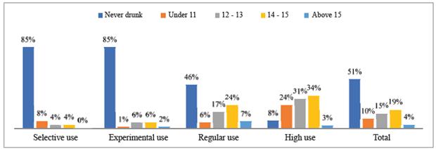 Selective use. People who use alcohol occasionally. Their consumption is limited to special celebrations. 44% were women and 56% men; this group is composed mostly of sixth, seventh and eighth grade students (see Figure 4).