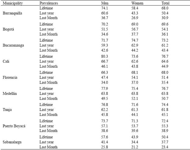 The last national study of psychoactive substance use in school students (Ministerio de Justicia y el Derecho, 2011), indicates that 63% of students in grades 6 to 11 of public and private schools in Colombia have consumed alcohol at least once in their life, that is, two out of every three school students in the study have tried it at some time; 57% did it in the last year and 40% did it in the last month. The latter prevalence increases with age and with school grade: students in the last school grades consume more compared to those in lower grades. No differences were observed with respect to sex, but with respect to the regions: Caldas, Bogotá, Risaralda, Antioquia and Boyacá occupied the first places, while the cities of the Atlantic Coast occupied the last places in alcohol consumption by teenagers.