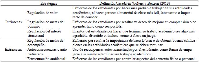 Respecto a estas estrategias de autorregulación de la motivación, en la literatura sobre el tema se ha encontrado que estudiantes universitarios de distintas zonas geográficas -como EE. UU. y Alemania- (Kim et al., 2018; Schwinger et al., 2012; Schwinger & Otterpohl, 2017; Wolters, 1998; Wolters & Benzon, 2013) utilizan diferentes estrategias, lo que ha permitido que diversos autores desarrollen sus propias formas de clasificar dichas estrategias. Tal es el caso de Wolters y Benzon (2013), quienes hicieron su clasificación a partir el carácter intrínseco o extrínseco de la estrategias de autorregulación de la motivación (véase Tabla 1).