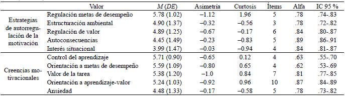 A continuación, en la Tabla 3 se pueden observar los estadísticos descriptivos y el alfa de Cronbach de las escalas de creencias motivacionales y de las estrategias de autorregulación de la motivación, donde se encuentra una distribución normal para todas las variables, así como niveles aceptables y buenos de confiabilidad.